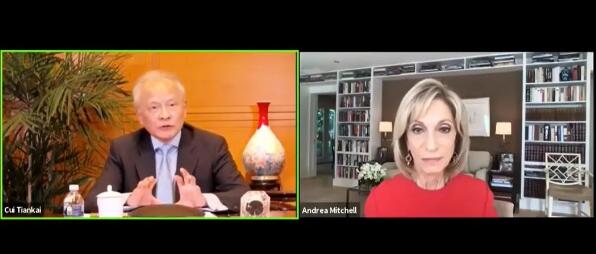 日前,中国驻美国大使崔天凯应邀出席2020年阿斯彭安全论坛,就中美关系有关问题与阿斯彭战略小组执行主任尼古拉斯·伯恩斯以及美国全国广播公司对外政策首席记者安德利亚·米歇尔进行在线对话,并回答观众提问。