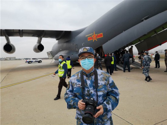 2月13日,空军派出大型运输机运送医疗物资和解放军支援湖北医疗队队员增援武汉。图为陈国全在天河机场采访。