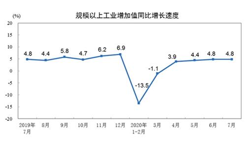 7月份,规模以上工业增加值同比实际增长4.8%(以下增加值增速均为扣除价格因素的实际增长率),增速与6月份持平。从环比看,7月份,规模以上工业增加值比上月增长0.98%。1—7月份,规模以上工业增加值同比下降0.4%。