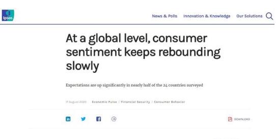 据官网介绍,全球消费者信心指数取自24个国家消费者信心指数的平均值。这项调查是基于益普索全球顾问在线平台对超过17500名75岁以下成人进行的月度调查。