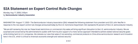 在美国商务部宣布进一步强化对华为及其关联公司使用美国技术和软件的限制后,8月18日,美国半导体行业协会(SIA)主席兼首席执行官约翰·涅弗(John Neuffer)在其官网上发布以下声明,以回应美国宣布的新的出口管制规则变化。