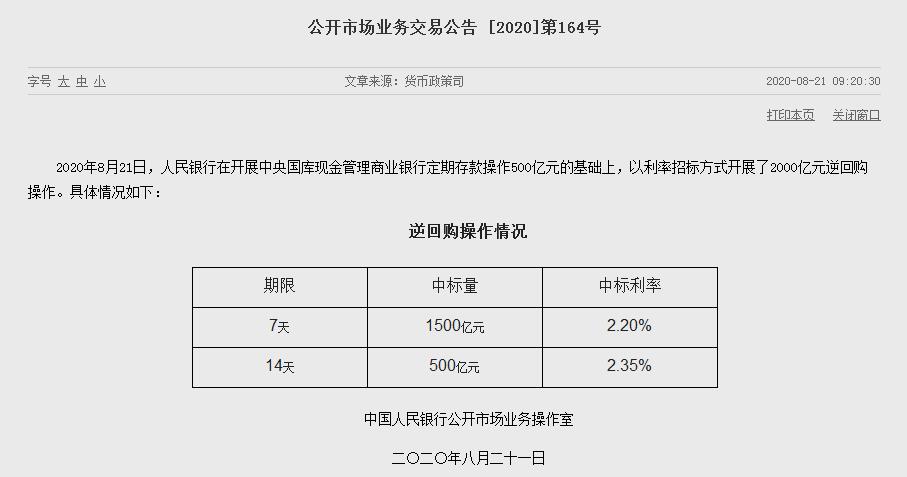 据央行网站21日消息,央行公告称,8月21日在开展中央国库现金管理商业银行定期存款操作500亿元的基础上,以利率招标方式开展了2000亿元逆回购操作。包括1500亿元7天期和500亿元14天期,中标利率分别为2.20%和2.35%,均与上次持平。