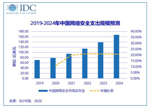 IDC认为,由于全球各国政府和企业对网络安全愈加重视,市场环境总体向好,疫情对全球网络安全市场产生的波动相对较小。在2020-2024年的预测期间内,全球网络安全相关支出将实现8.1%的CAGR(年均复合增长率),预计2024年将达到1747.3亿美元。