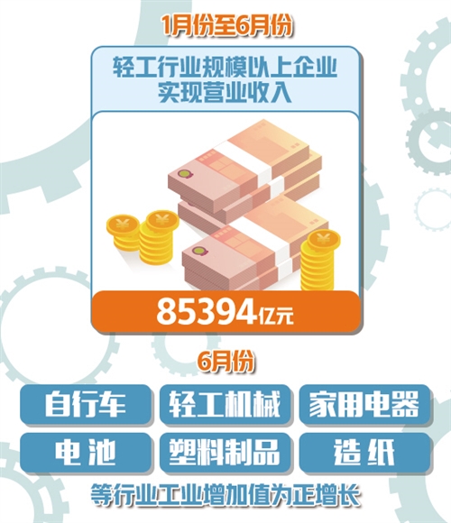 公布的数据显示,6月当月,轻工行业生产延续企稳回升态势。其中,自行车、轻工机械、家用电器、电池、塑料制品、造纸等行业工业增加值为正增长。