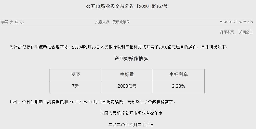 8月26日电 据央行网站公告,为维护银行体系流动性合理充裕,8月26日人民银行以利率招标方式开展了2000亿元7天期逆回购操作。