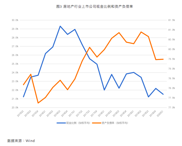 如图3所示,2015年~2017年,房地产行业上市公司的现金比率先升后降,并在2018年保持相对稳定。2019年下半年以来,房地产行业的现金比率再次下降,到2020年一季度只有21.5%左右,回到了2015年初的水平。资产负债率则从2015年下半年持续上升,到了近半年才略有下降。同时,现金比率快速下降的阶段基本对应了资产负债率持续上升的阶段。两个指标均表明,2018年以来,房地产债务可持续性已经出现恶化,但由于近期杠杆率没有进一步提高,债务风险尚在可控范围之内。