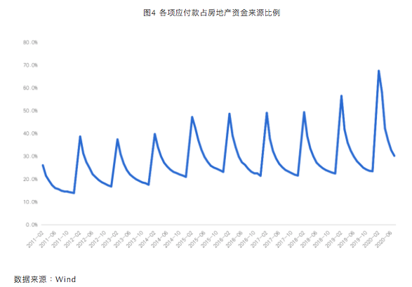 疫情冲击进一步放大了房地产企业的现金流压力,表现为房地产对上下游企业的款项拖欠规模增加。如图4所示,房地产投资来源中的各项应付款占比具有明显的季节特征,年初最高,随后几个月逐渐降低。2015~2018年,各项应付款占房地产开发资金来源的比例和季节特征相对稳定。