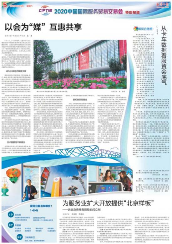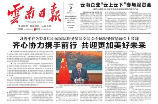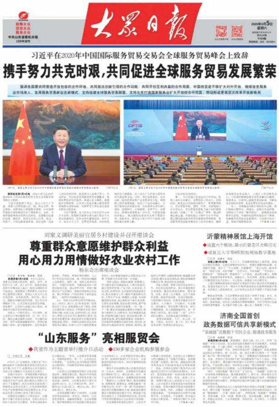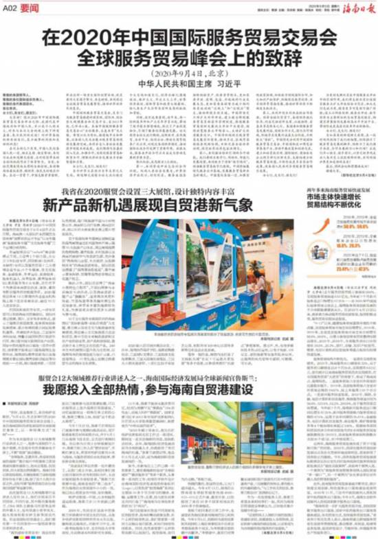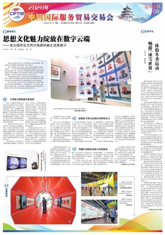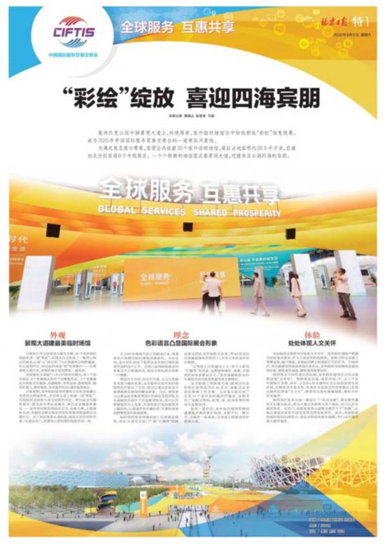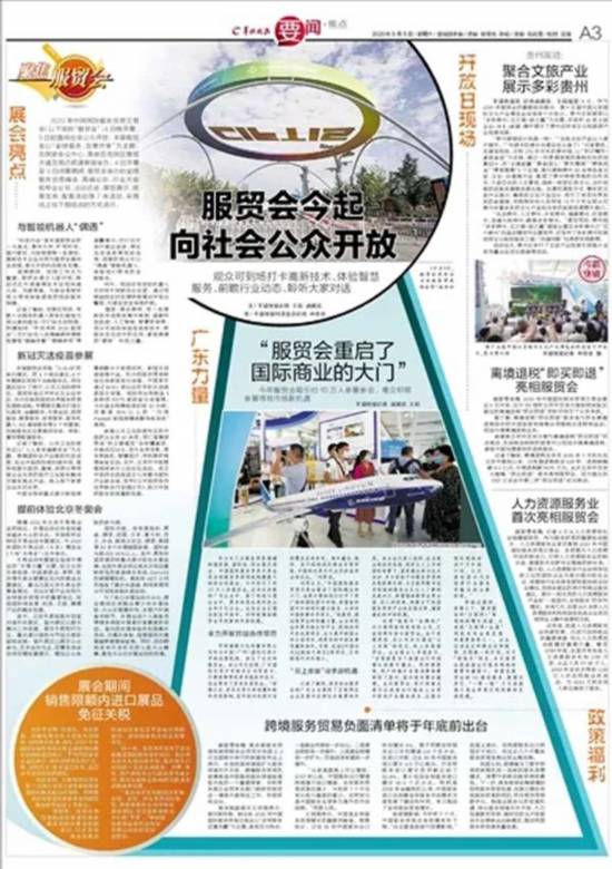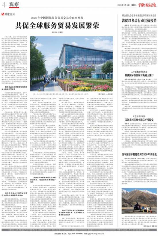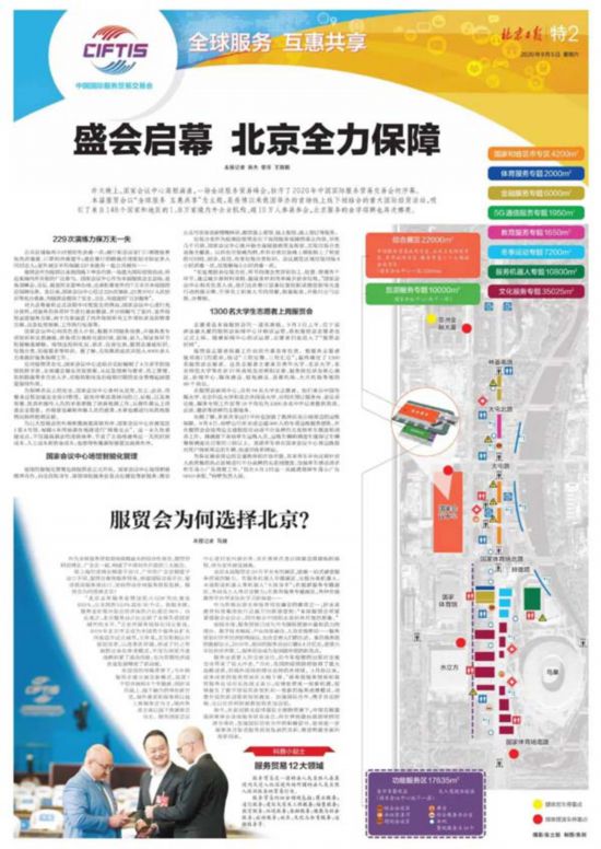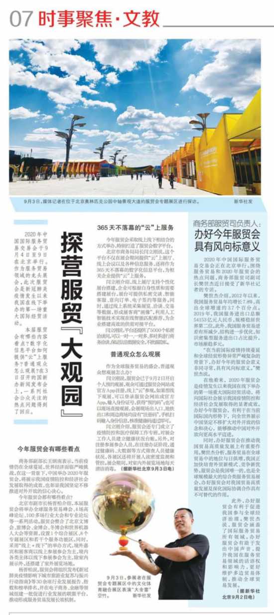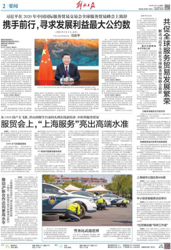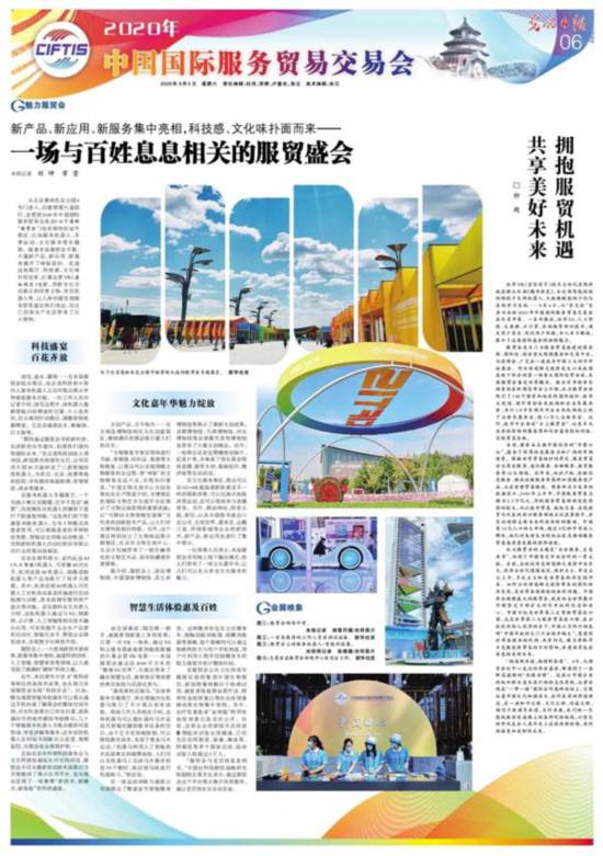 9月4日晚,2020年中国国际服务贸易交易会开幕,习近平主席通过视频方式致辞,“服贸会”时间到来。在全球疫情尚未得到完全控制,经济全球化遭遇逆流的大背景下,以线上线下相结合的方式举办重大国际经贸活动,疫情发生以来还是头一次,服贸会可谓备受关注,各家媒体也用不同报道形式聚焦服贸会,一些媒体还开设展位,通过栏目展示、多媒体互动体验等,集中展示媒体融合最新成果。今天,我们通过一组报纸版面带大家一起走进“服贸会”,触摸和感受它的不同寻常和特别意义。