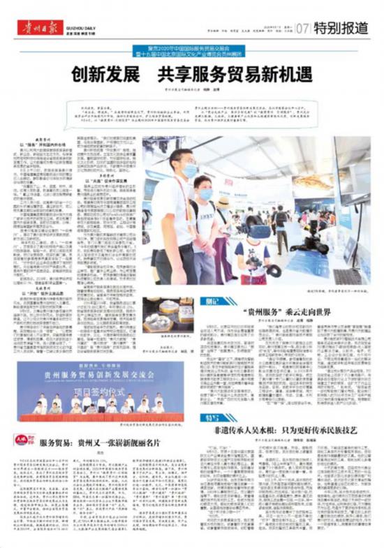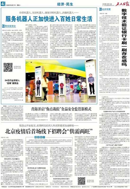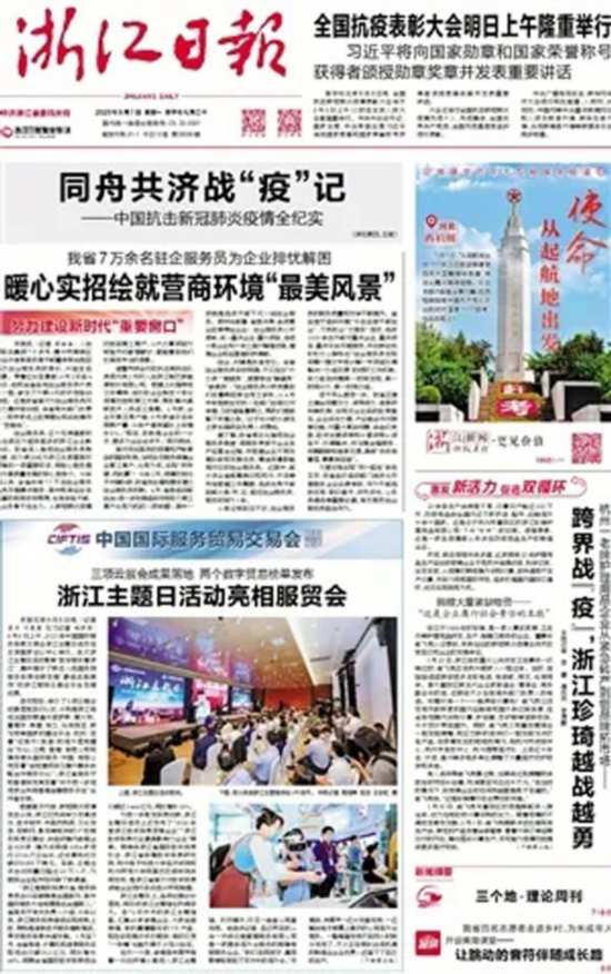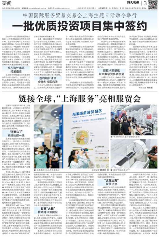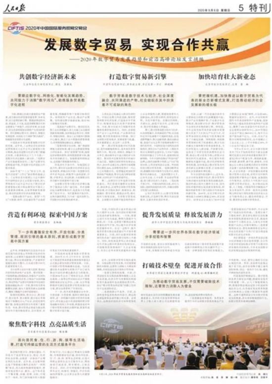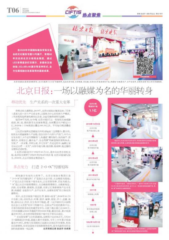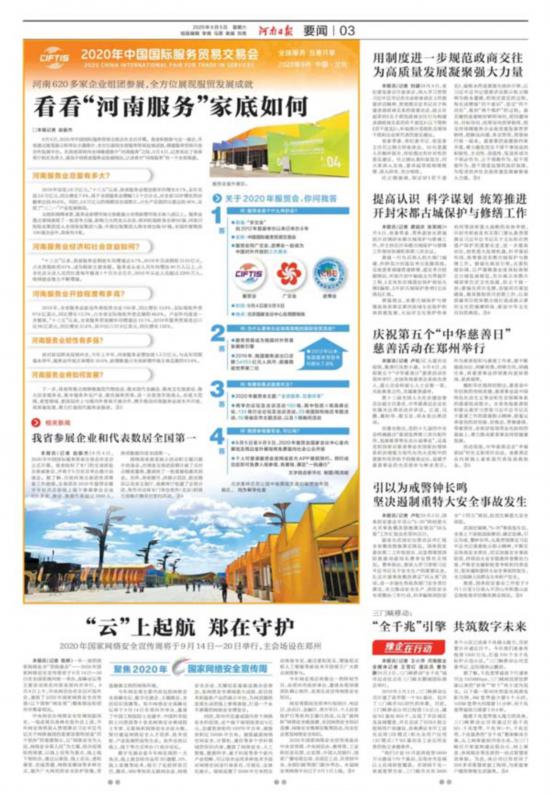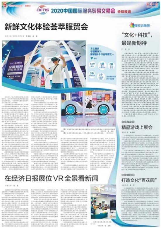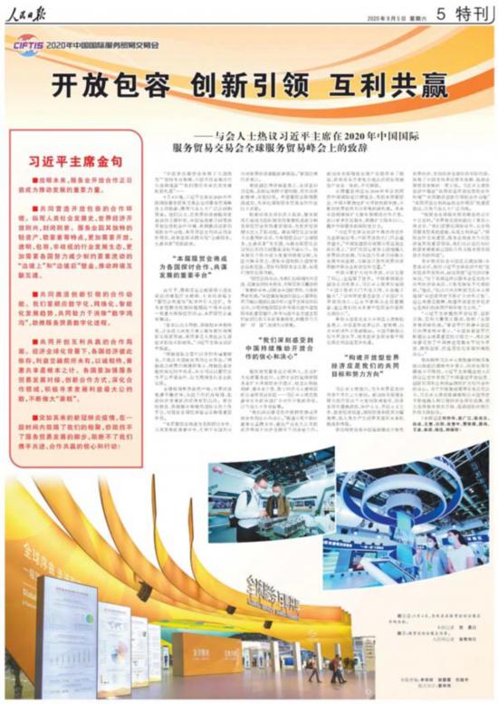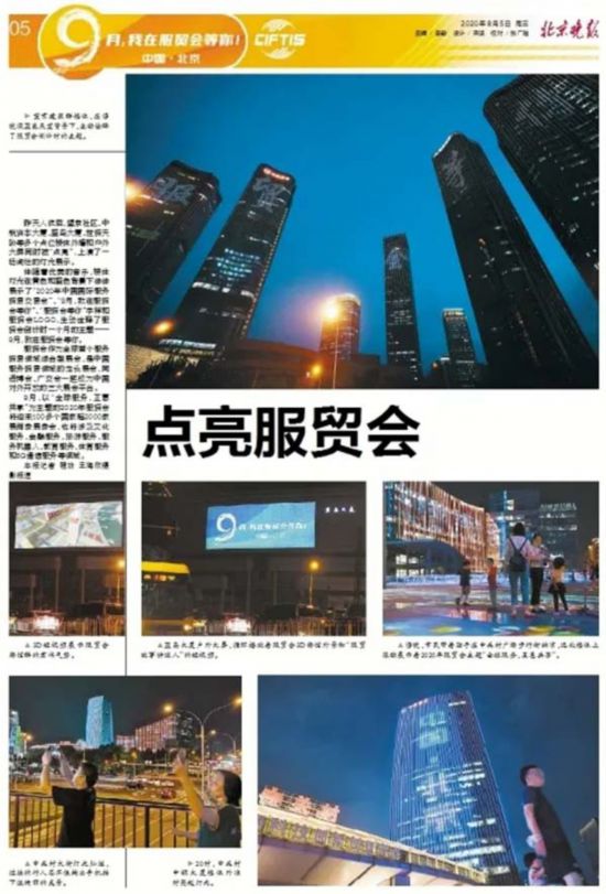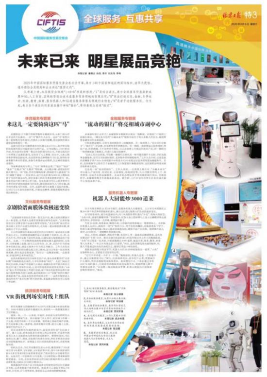 9月4日晚,2020年中国国际服务贸易交易会开幕,习近平主席通过视频方式致辞,“服贸会”时间到来。在全球疫情尚未得到完全控制,经济全球化遭遇逆流的大背景下,以线上线下相结合的方式举办重大国际经贸活动,疫情发生以来还是头一次,服贸会可谓备受关注,各家媒体也用不同报道形式聚焦服贸会,一些媒体还开设展位,通过栏目展示、多媒体互动体验等,集中展示媒体融合最新成果。今天,我们通过一组报纸版面带大家一起走进“服贸会”,触摸和感受它的不同寻常和特别意义。