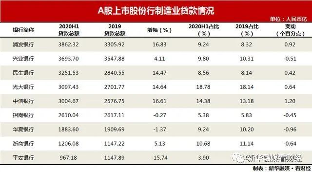 记者注意到,去年末,兴业银行、民生银行、中信银行、招商银行、华夏银行、平安银行的制造业贷款为负增长态势,而到今年6月末,前三者已然转为正增长,其中,中信银行今年上半年制造业贷款增速达到16.61%,而2019年全年,该行增速为-12.65%,与此同时,该行制造业贷款占比上升幅度达到了1.20个百分点,从去年末的13.18%提升至14.38%。在三家负增长的银行中,招商银行和华夏银行增速分别为-0.27%、-1.37%,下滑幅度较小。
