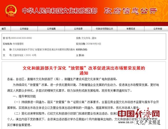 北京9月16日讯 近日,文化和旅游部印发《关于深化“放管服”改革促进演出市场繁荣发展的通知》,以深化演出市场“放管服”改革为切入点,进一步优化营商环境,增强企业发展内生动力,更好地满足人民群众多样化、多层次的精神文化需求。