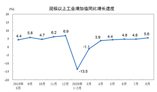 9月17日讯(记者 郭涛) 国家统计局近日发布数据显示,8月,全国规模以上工业增加值同比增长5.6%,较上月加快0.8个百分点,增速已接近上年平均水平;1-8月,工业增加值同比增长0.4%,而1-7月为下降0.4%,累计增速实现由负转正,工业生产复苏态势持续巩固。