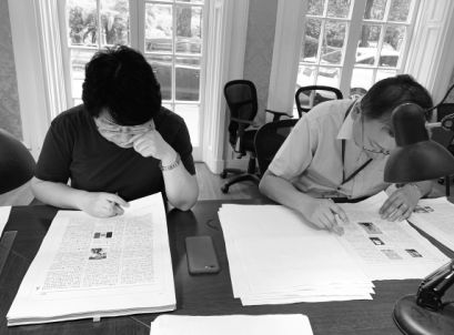 上海辞书出版社社长秦志华(右)和副总编辑张敏审读《辞海》(第七版)校样。
