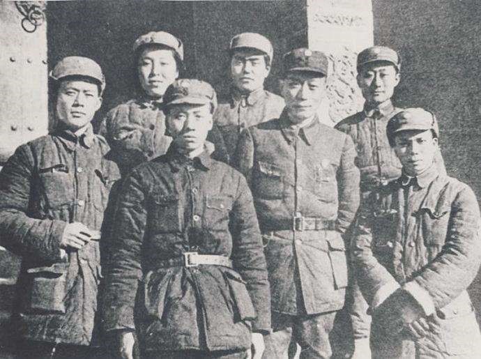 聂荣臻司令员和八路军总政前线记者团等人合影,左起为:雷烨、范谨、韦明、沈蔚、聂荣臻、林朗、李力克