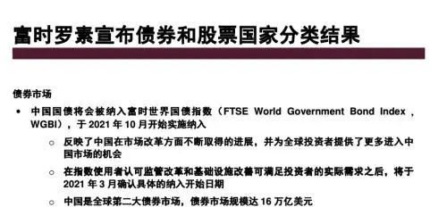 9月25日,富时罗素公司宣布将中国国债纳入富时罗素全球政府债券指数(WGBI),预计将于2021年10月生效。具体纳入日期须经过2021年3月的半年度评估,才能最终确定。