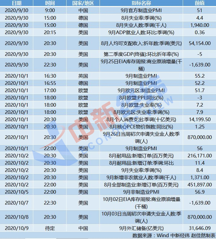 未来两周,中国将公布9月官方制造业PMI、9月外汇储备;美国将公布第二季度GDP、9月失业率、8月人均可支配收入等数据;英国、德国、欧盟、美国等将公布9月制造业PMI;欧盟将公布8月PPI、失业率等数据。
