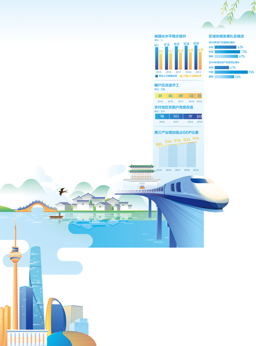 城市规模不断扩大、城市经济持续发展的同时,乡村振兴也迈开大步。脱贫攻坚取得决定性成就,全国农村贫困发生率从2015年的5.7%降至2019年0.6%,城乡居民收入差距不断缩小,城乡居民人均可支配收入之比从2017年的2.71降至2019年的2.64。基础设施建设、基本公共服务不断向农村延伸。截至2019年10月底,建档立卡贫困人口参加基本养老保险5977万人,基本做到应保尽保。2019年,全国新改建农村公路29万公里,提前实现具备条件的乡镇和建制村通硬化路。农村人居环境不断改善,90%以上乡镇生活垃圾集中处理或部分集中处理,农村“厕所革命”加快推进。