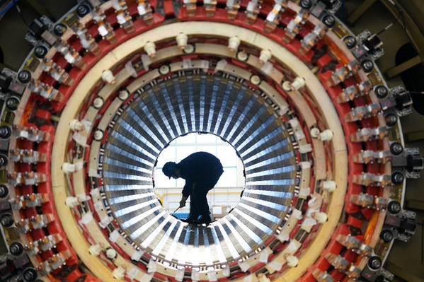 在哈电集团哈尔滨电机厂有限责任公司的生产车间,工人在进行生产作业。