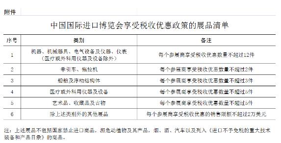 一、对进博会展期内销售的合理数量的进口展品免征进口关税、进口环节增值税和消费税。享受税收优惠的展品不包括国家禁止进口商品,濒危动植物及其产品,烟、酒、汽车以及列入《进口不予免税的重大技术装备和产品目录》的商品。