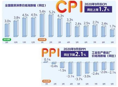 10月15日,国家统计局发布了9月份全国居民消费价格指数(CPI)和工业生产者出厂价格指数(PPI)数据。9月份,CPI同比上涨1.7%,今年首次进入“1区间”;PPI同比下降2.1%,同比降幅略有扩大。