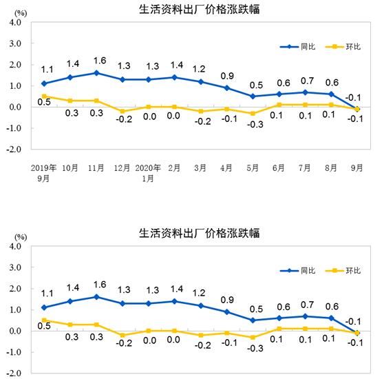 2020年9月份,全国工业生产者出厂价格同比下降2.1%,环比上涨0.1%;工业生产者购进价格同比下降2.3%,环比上涨0.4%。1―9月平均,工业生产者出厂价格比去年同期下降2.0%,工业生产者购进价格下降2.6%。