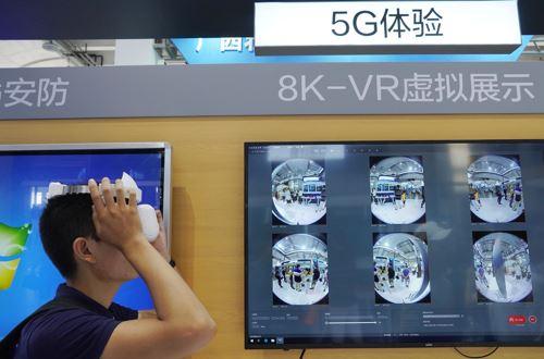 观众在展区体验5G网络搭建的8k-VR直播。-新华社