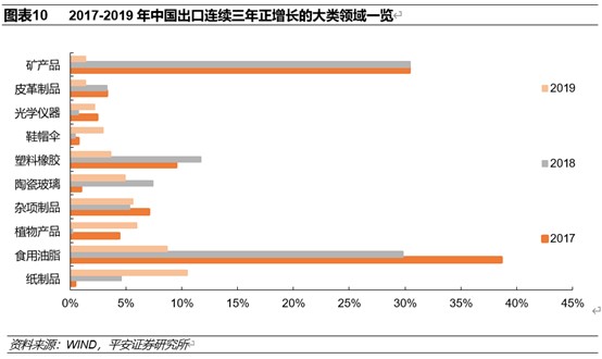 从结构上看,由于中国劳动力成本上行导致劳动密集型产业的竞争力趋弱,加上2018-2019中美贸易摩擦带来的负面冲击,中国部分行业产能出现向东南亚等地搬迁的情况,但仍有部分行业的出口持续稳健。按照2017-2019年分类出口数据看,中国在矿产品、皮革制品、光学仪器、鞋帽伞、塑料橡胶、陶瓷玻璃、杂项制品、植物产品、食用油脂及纸制品领域的出口竞争力依然维持强势。