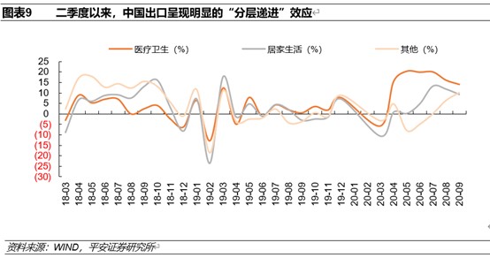 按此划分可以明显发现,中国出口在2020年一季度大幅回落后,呈现出明显的“分层递进”效应。率先复苏且恢复力度最强的就是医疗卫生相关的“第一层次行业”,其出口同比增速在二季度一直维持在20%以上的高位,虽然在三季度有所下行,但9月仍处于14%以上的水平,是此轮出口好转的第一动力;而作为“第二层次行业”的居家生活领域的出口,虽然其5月之前表现偏弱,但之后几个月增速明显上行至7月的13.3%,之后虽有回落,但9月仍达到9.3%的增速;而其他受疫情冲击的行业,即“第三层次行业”的增速直到7月才告别负增长,之后便接过接力棒,在三季度增速持续上行,并于9月达到年内最高的10.2%,超越了“第二层次行业”,直逼“第一层次行业”。