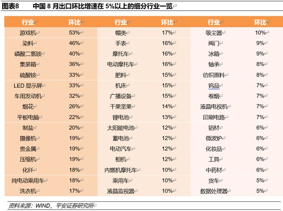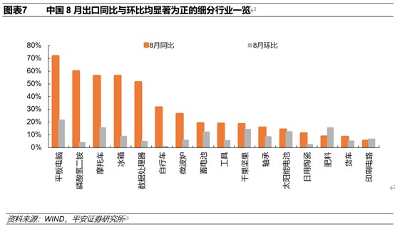 分行业看,基于数据的可得性(最新细分数据公布到8月,仅有少数细分行业公布9月数据),中国在电子、电池、化工化肥、交通设备、家电、机械、陶瓷等领域在8月的出口不仅在环比上取得了显著上涨,而且在同比上也获得了较大程度的提升。若仅按8月环比数据看,除了电子、电池、化工化肥、交通设备、家电、机械、陶瓷等领域之外,还有半导体、金属制品、药材、纺织原料以及众多中间品获得了显著的正增长。