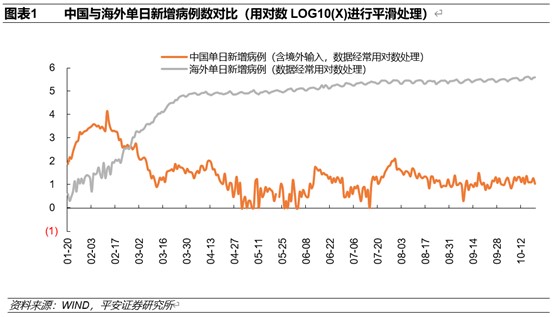 2020年新冠疫情爆发后,中国与海外在短短一个季度内发生了显著的疫情分化。中国经历了1月-2月中短暂的疫情上升期后,在严格封锁与协同抗疫之下,中国疫情在2月下半月开始明显好转,进入3月后,疫情基本可控;虽零星有地区出现局部疫情,但均很快得到控制;持续面临的境外输入病例也得到了有效管控。但是,海外疫情从1月下半月出现后,2月中旬之前尚未大规模爆发,但在2月下旬之后就迅速蔓延,单日新增病例数也很快超过国内,并于3月中旬达到日增万例的状态,4月初则进入日增十万例的水平,近期单日新增病例数更是达到接近40万的程度。