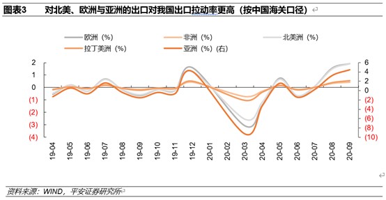 从中国对各洲别出口的月度数据看,中国对北美、欧洲以及非洲的出口同比增速恢复较快,而对亚洲与拉美的出口同比增速恢复偏慢。由于对非洲出口占中国总出口比重较低,尽管增速回升较快,但拉动作用有限;所以,主要是北美与欧洲的需求上行带动了中国出口同比增速的抬升。
