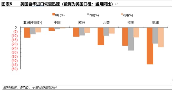 由于新冠疫情的冲击,美国进口整体增速显著为负,分月度看,美国自亚洲(中国以外)、中国、欧洲、北美进口的月度同比逐月回升;另外,美国自拉美进口的月度同比在7月达到最大规模的负增长,8月显著收窄;美国至非洲进口的月度同比虽然在7月显著好于6月,但8月再度转差。