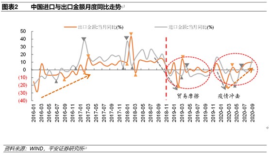 但是,随着国内外疫情发展的分化,中国疫情得到控制后,复工复产迅速推进,出口需求也得到一定程度的恢复;海外疫情则从欧美国家逐渐蔓延至新兴市场,导致众多海外经济体在3-5月实行封锁,生产生活受到极大干扰,这导致了对中国出口的替代性需求有所抬升,进一步加快了中国出口的恢复。同时,中国进口在海外疫情蔓延以及前期国内经济下滑的滞后影响下,在4-5月大幅下行,之后随着国内经济企稳与海外疫情阶段缓和逐渐有所回升。疫情错位反映到外贸数据上就是,中国出口同比增速在3月就显著抬升,4月即回正,6月至今一直维持正值,并持续上行;进口同比增速在4、5月大幅转负至-14.2%与-16.6%,后显著回升并转正,9月更是出现两位数(13.2%)的同比增长。