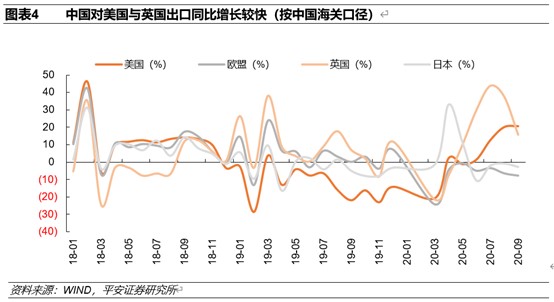 分国别看,在主要发达经济体中,中国对美国与英国的出口同比增速较快,其中对美出口的月度同比在8-9月上行至20%以上,对英出口增速也回升至15%以上,其中7-8月甚至升至40%左右的水平;相较而言,中国对欧盟与日本的出口增速并未出现显著改善。