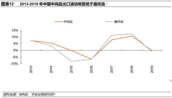 同时,中国在工业制造业中间品领域的出口稳健性显著高于最终品,考虑到中国中间品出口占总出口规模接近一半,中国未来数年的出口仍有一定韧性。