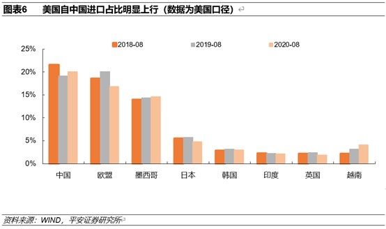 分国别看,观察美国自各国进口规模占美国总进口规模的比重可以发现,在2019年8月的美国自各国进口占比中,仅有中国与印度低于2018年8月的水平,欧盟、墨西哥、日本、韩国、英国、越南均有所上行。而在2020年8月,除了中国与越南明显较2019年8月水平更高之外,仅有墨西哥微幅上行,其他经济体均显著回落,其中欧盟、日本与英国回落最为明显,而印度与韩国回落程度偏小。