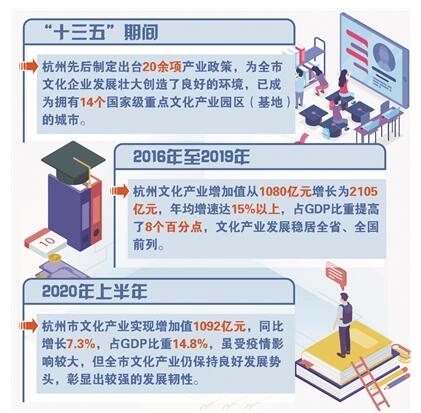 2016至2019年,杭州文化产业增加值从1080亿元增长为2105亿元,年均增速达15%以上,占GDP比重提高了8个百分点,成为我市国民经济重要的支柱性产业。
