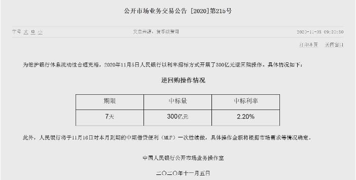 11月5日电 5日央行公告称,为维护银行体系流动性合理充裕,以利率招标方式开展了300亿元7天期逆回购操作,中标利率2.20%与此前持平。据统计,央行16个工作日累计逆回购规模达12200亿元。此外,人民银行将于11月16日对本月到期的中期借贷便利(MLF)一次性续做,具体操作金额将根据市场需求等情况确定。