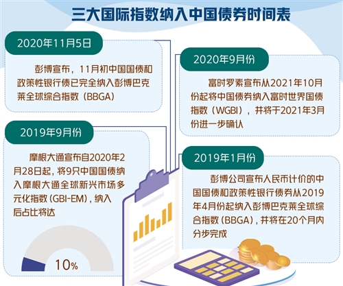 2019年1月31日,彭博公司宣布人民币计价的中国国债和政策性银行债券从2019年4月份起纳入BBGA。摩根大通紧随其后,于2019年9月份宣布从2020年2月28日起,将9只中国国债纳入GBI-EM,纳入后中国国债占比将达10%,已经达到国别占比上限。这一过程将分10个月完成。市场估算,完全纳入GBI-EM可带来200亿美元资金流入。2020年9月25日,富时罗素宣布从2021年10月份起将中国债券纳入WGBI,并将于2021年3月份进一步确认。