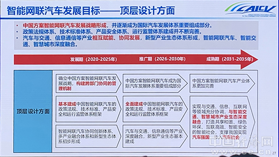 具体来看,顶层设计方面包括3个发展目标:一是中国方案智能网联汽车发展战略形成,并逐渐成为国际汽车发展体系重要组成部分;二是政策法规体系、技术标准体系、产品安全体系、运行监管体系建成并不断完善;三是汽车与交通、信息通信等产业相互赋能、协同发展,新型产业生态体系形成,智能网联汽车、智能交通、智慧城市深度融合。