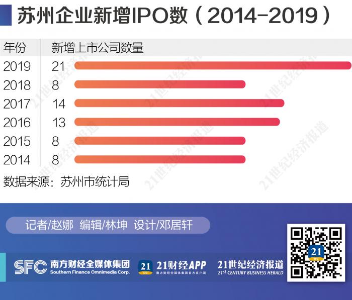 根据苏州市统计局发布的《2019年苏州经济和社会发展概况》,苏州2019年全年新增上市公司21家,累计达153家,其中境内A股上市公司120家,累计募集资金3031亿元。科创板上市企业6家,数量列全国第三位。