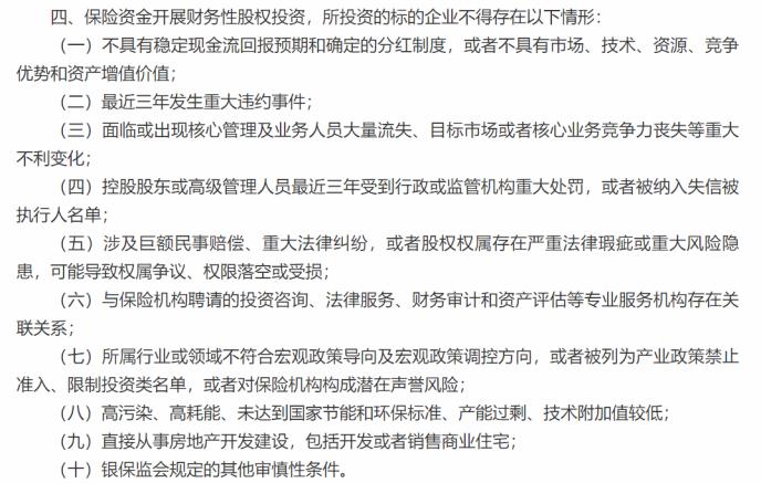 此外,新政进一步明确,投资标的企业应属于成长期、成熟期或战略性新兴产业,或者具有明确的上市意向及较高并购价值。同时鼓励保险资金开展市场化、法治化债转股项目。