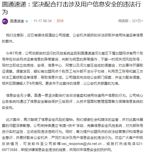 对此,圆通速递今日发布微博表示,调查发现,疑似有加盟网点个别员工与外部不法分子勾结,利用员工账号和第三方非法工具窃取运单信息,导致信息外泄。公司随后向当地公安部门报案,并全力配合调查。相关犯罪嫌疑人于9月落网。