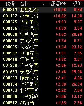 11月19日早盘,汽车相关板块逆市上涨,截至发稿,亚星客车、小康股份涨停,华菱星马、福田汽车、江铃汽车等多股均不同程度拉升。