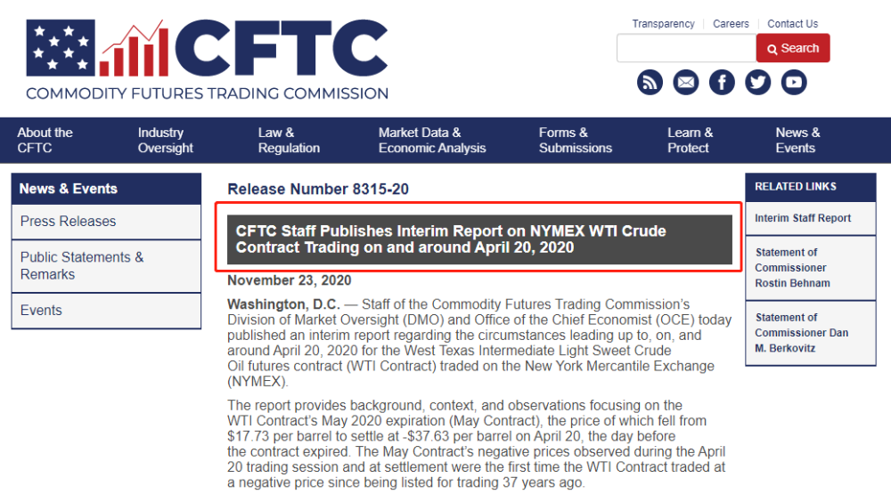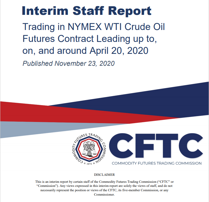 美国商品期货交易委员会(CFTC)最新发布了一份关于今年4月“负油价”事件的调查报告,报告透露“负油价”事件由基本面因素和技术面在内的多种因素导致,包括油市供应过剩、疫情导致需求减少、供需不确定性等。
