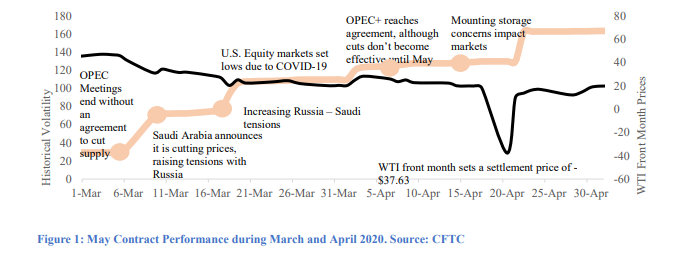 CFTC在报告中总结道,“负油价”是一系列广泛的基本面因素共同作用的结果。供过于求的全球原油市场遭遇前所未有的需求下降,而对于规模和持续时间的不确定性,将市场波动性推至历史水平。欧佩克+减产协议在3月份被解除,减产措施推迟到5月份才恢复,进一步加剧了对原油供应过剩的担忧,最终引发了对市场储存过剩产量能力的担忧。这些担忧在作为WTI实际交割合同交割点的库欣仓储设施尤为紧迫。