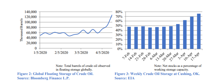 第二个导致“负油价”的基本面因素则来自于原油储藏方面。报告指出,新冠肺炎疫情使本已供过于求的全球原油市场需求大幅下降。尽管欧佩克+达成协议减少原油供应,但减产预计要到2020年5月才会开始。因此,在短期内,对原油生产供过于求和原油仓储能力供应不足的担忧持续增加。