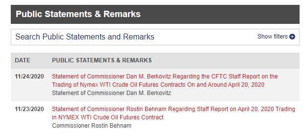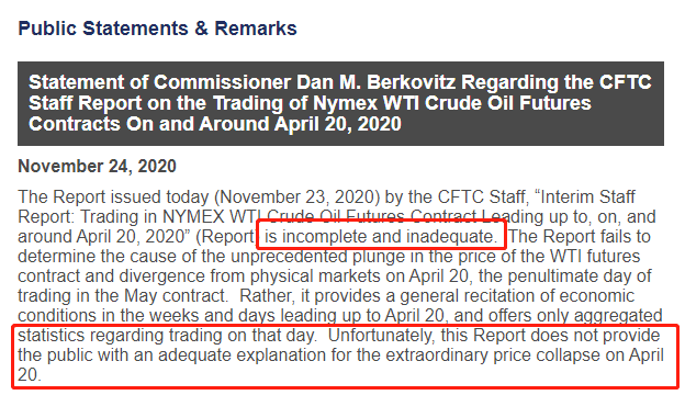 而Dan M. Berkovitz则在声明中指出,此前发布的报告是“不完整”且“不恰当”的。声明中提及,报告未能确定WTI期货合约价格空前下跌的原因。报告仅列举了提供了事件发生前几天(周)的经济状况,以及有关当天交易的数据汇总。遗憾的是,这份报告没有为公众提供对4月20日价格暴跌的原因的充分解释。
