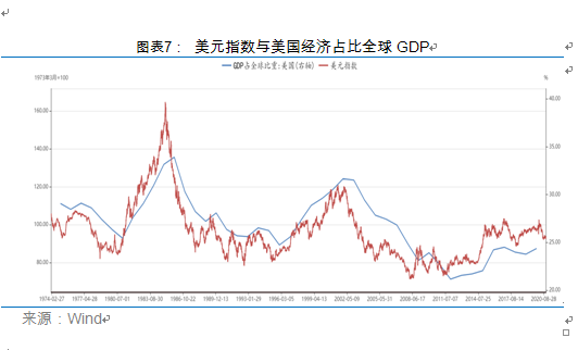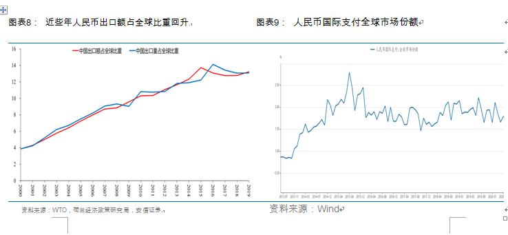 3.人民币汇率不能简单从美元一个角度来看,同时也要从人民币自身角度——中国经济与央行态度来观察。2019年以来,中国出口额占全球比重开启上行,尤其2020年新冠肺炎疫情下,欧美经济下行,中国出口承担了欧美经济补库存缺口,导致人民币汇率走强。从未来趋势上来看,随着中国经济体量在全球比重增加,人民币国际支付定位将受到进一步支撑,支持人民币汇率走强,甚至可能升破6.0。