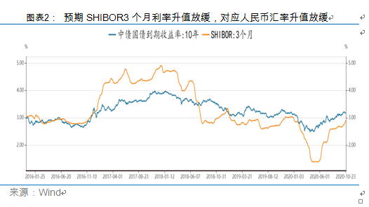 1)SHIBOR利率升值趋势将放缓,中美利差短期可能走弱。跨境资本流动是分析人民币汇率走势的一个重要维度,主要跟中美利差有关,SHIBOR利率也是一个观察变量。当前,中美利差维持强势背后是中国经济稳定复苏,货币政策的提前退出。截至10月24日,SHIBOR3个月周平均利率收于2.85%,前值2.75%,中美利差周平均利率收于2.36%,前值2.47%;当前SHIBOR3个月利率已经快速恢复到2018~2019年水平,10年期国债收益率也已经到了3.2%的疫情前水平——即便当前SHIBOR收益率还能继续上涨,但基于当前经济恢复情况——2020年三季度不变价23.92万亿元,同比4.90%,累计同比0.70%,累计同比依然远低于疫情前,当前利率上升趋势应当出现缓和,对应人民币汇率升值趋势放缓。